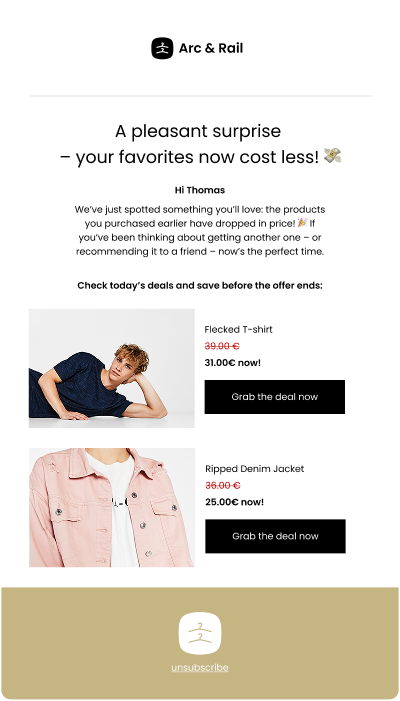Every day, the system checks if contacts who previously purchased a product match three conditions: the product’s price dropped yesterday, their last purchase happened between 30 and 365 days ago, and they have email consent. If the contact isn’t in the Capping email segment, the system sends an email with products they’ve previously purchased that are now cheaper. Once the message is sent, a Capping email event and segment are added to pause further messages for seven days.